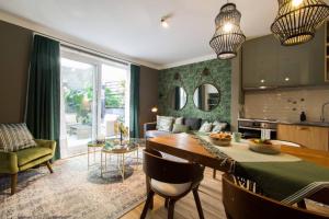 Ubytování sestává z jedné ložnice a obývacího pokoje s rozkládací pohovkou a posezením na dřevěných podlahách s topením pro větší pohodlí. Plně vybavený kuchyňský kout nabízí moderní spotřebiče jako troubu, varnou desku, lednici, myčku nádobí, mikrovlnnou troubu, kávovar i rychlovarnou konvici spolu s potřebným nádobím a jídelním stolem vhodným pro rodiny včetně dětské židličky a možnosti dětské postýlky.